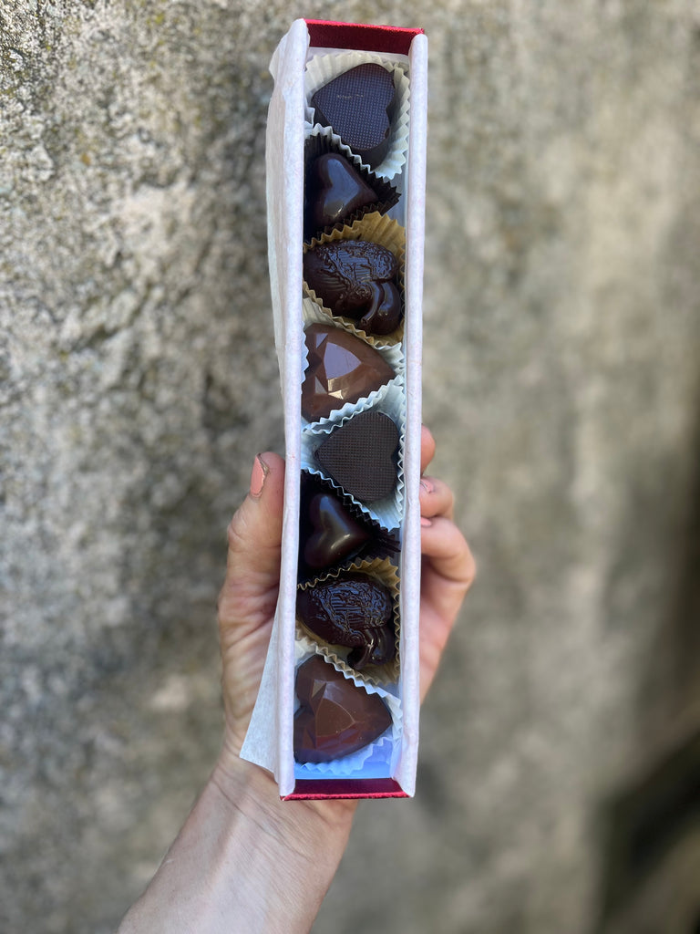 Long red sparkle box filled with 8 seasonal heart bonbons. Includes 2 dark chocolate sea salt caramel hearts, 2 milk chocolate hazelnut hearts (think nutella), 2 dark chocolate garam masala peanut butter bonbons, 2 passion fruit & chile de arbol corazones