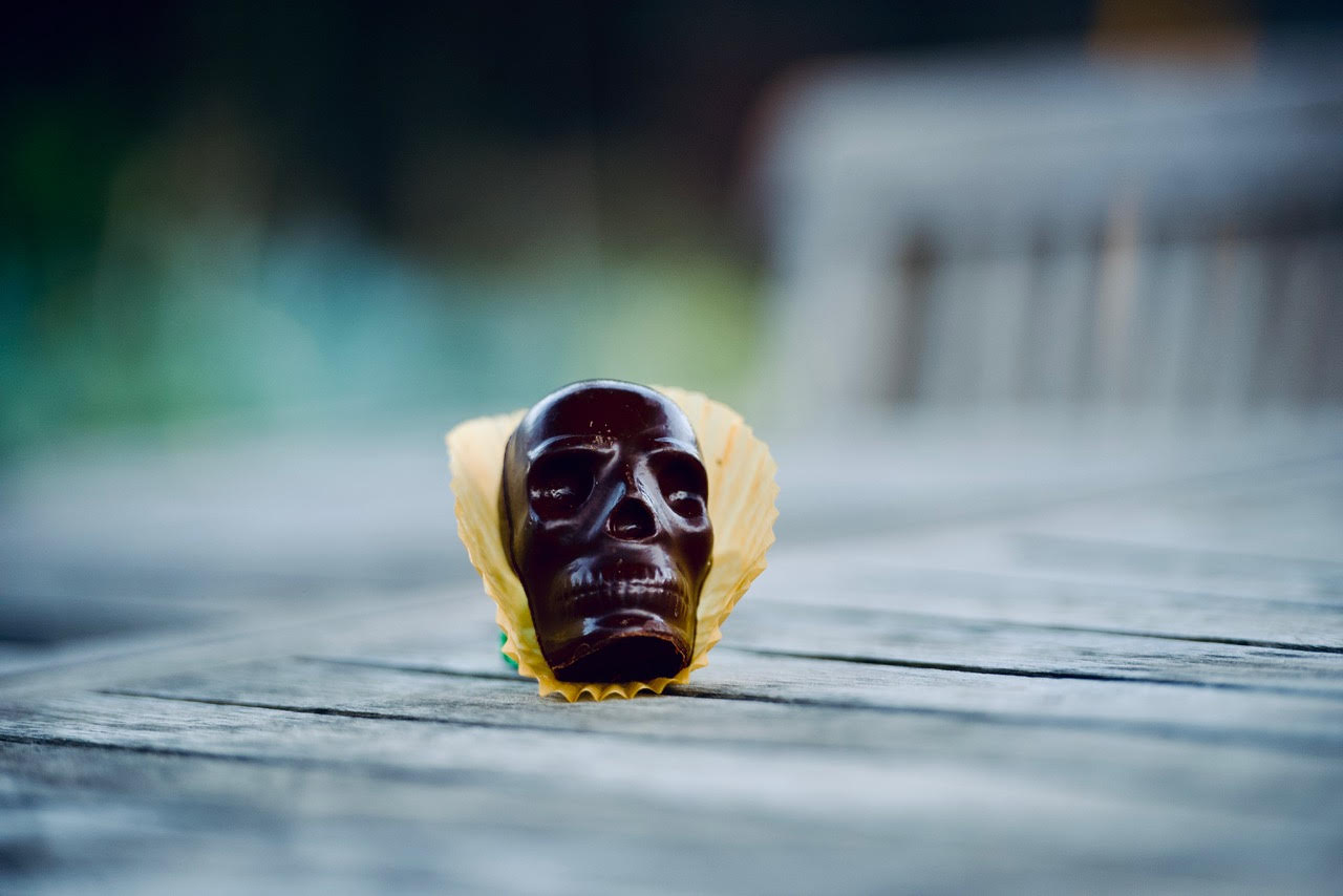 Dark chocolate skull filled with dark chocolate ras el hanout ganache, pomegranate caramel, pistachio praline & house-made vanilla bean marshmallows (4 ounces)