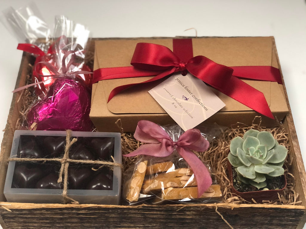18 piece assorted truffle gift box, 8 piece sea salt caramel filled dark chocolate heart bonbon box, nuts for you heart- 2.5 oz. faceted dark chocolate heart filled with a layer of sea salt caramel, almonds, walnuts, pepitas, herbed marcona almond brittle & sea salt, hot & smoky heart- 2.5 oz. faceted dark chocolate heart filled with dark chocolate ganace infused with hot Hungarian & Spanish smoked paprikas, 4oz herbed marcona almond brittle and a sweet succulent all nestled in a custom, reclaimed wood crate.